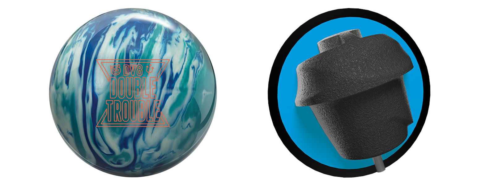 The DV8 Double Trouble is the latest evolution of the Trouble Maker line. It shares the symmetrical Dualistic weight block with the Trouble Makers, which is a core shape that was designed for bowlers who don’t use a thumb hole. The coverstock has been changed to the HK22 – Havoc Pearl formulation. This pearlized cover is finished with 500/1000/1500 SiaAir and Factory Compound, allowing it to clear the front of the lane easily and make a big move when it finds the friction.