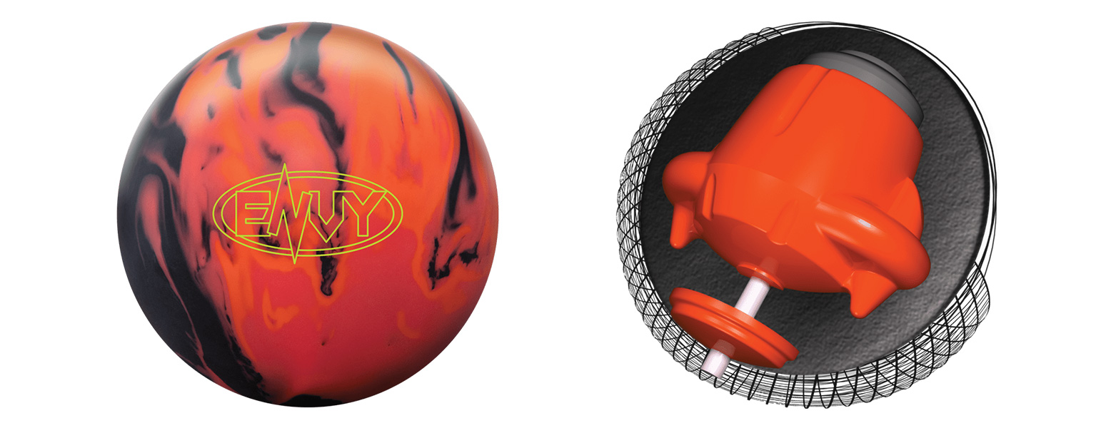 The Envy sets the bar for total hook in the Hammer line. It uses the new asymmetrical Launcher core design and the new Envy Solid coverstock, finished at 500/1500 SiaAir. This core shape offers a large amount of flare potential, while the dull solid cover provides plenty of traction for all styles of bowlers. With more hook than the 3-D Offset or any other ball in the current Hammer line, the Envy is a great new option for heavy oil conditions.