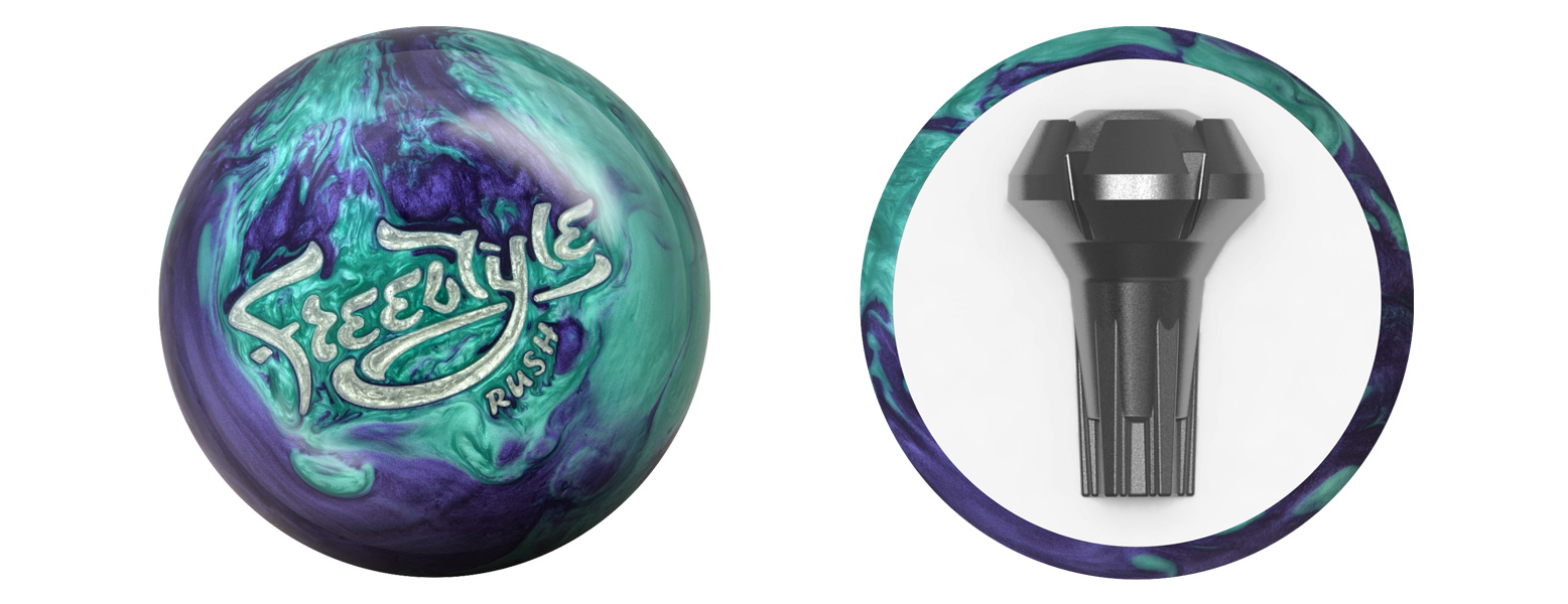 The Freestyle Rush is the newest weapon for medium to dry lane conditions in the Motiv line. The Rush uses a new coverstock and core compared to the Freestyles that were released last season. The Recon core keeps the same shape, but the densities have been altered, resulting in the Rush having a total differential of 0.030″, which is 0.005″ higher than the original Freestyle’s differential. The coverstock also has been upgraded to the new Agility LFP formulation that gives the Freestyle Rush more total hook than the Turmoil LFP that was used on the originals from last year.