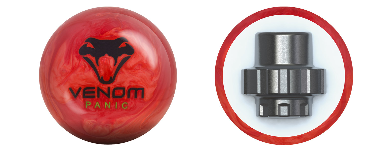 The Motiv Venom Panic is the newest addition to the Venom line. This ball uses a new coverstock that is cleaner through the front of the lane than the Venom Shock on medium volume patterns. Like the Shock, it uses Motiv’s symmetrical Gear core design.