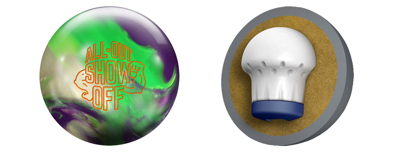 The All-Out Show Off is the newest reactive hybrid addition to Roto Grip’s HP2 line. This ball joins the pearlized Wreck-Em and the solid original Show Off, adding a new option with easy length and strong downlane motion to this price point. The All-Out Show Off uses the same Hotshot core as the Show Off, but this time it is paired up with the polished Stoked hybrid coverstock. This ball got through the front of the lane with no problem, retaining plenty of energy for a strong motion at the breakpoint and back end.