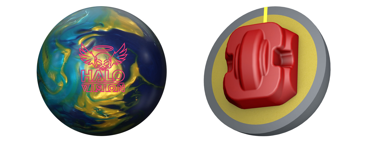 The Roto Grip Halo Vision is the new hybrid-covered addition to the Halo series, coming out of the box at a 4000 grit finish. Along with the Halo and Halo Pearl, the Vision is the third ball in Roto Grip’s HP4 line to use the asymmetrical Centrum core design. The combination of its eTrax-H19 hybrid reactive coverstock and higher grit finish gives this ball more length and angularity than the original Halo. This ball’s large amount of flare potential and aggressive cover make it a strong contender on slicker conditions.