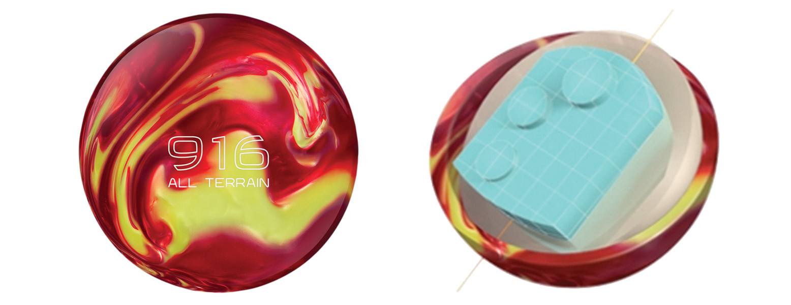 The 916 All Terrain is the first ball from Track that was designed to combine the best of both an “A” ball and a “T” ball. With the box finish, users will find the traction type of reaction with a little extra pop at the back end. Polish will transform this ball into angular motion while maintaining just enough of the traction motion. To create this unique combination, Track modified the Leggo core in order to lower the RG, differential, and intermediate differential, all at the same time. The cover is a new one for Track called HP Gen 4 “All Terrain”, which is the final piece of the puzzle in developing this new look. The new cover comes at a